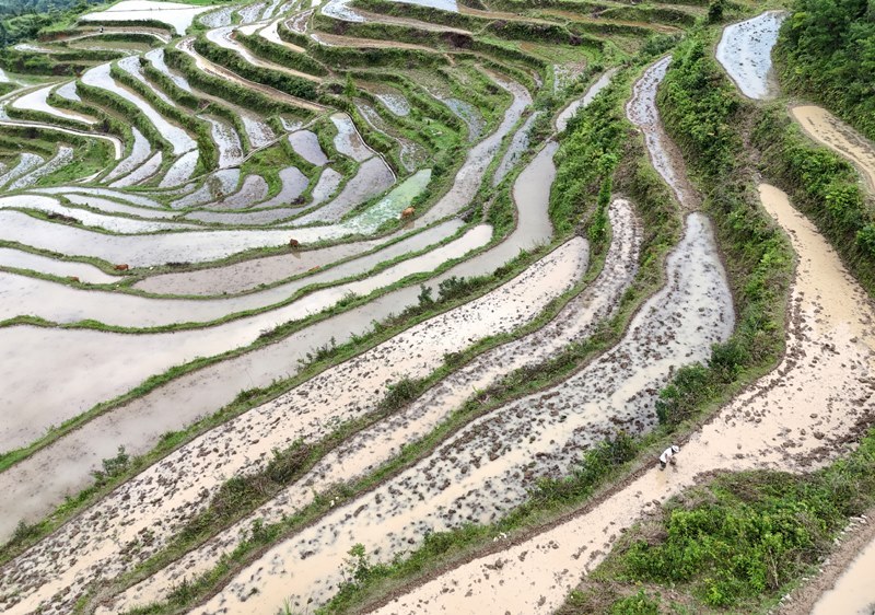 6月14日,在浙江省永嘉縣茗岙鄉(xiāng)梯田,農(nóng)民進(jìn)行水稻插秧準(zhǔn)備工作(無人機照片)。
