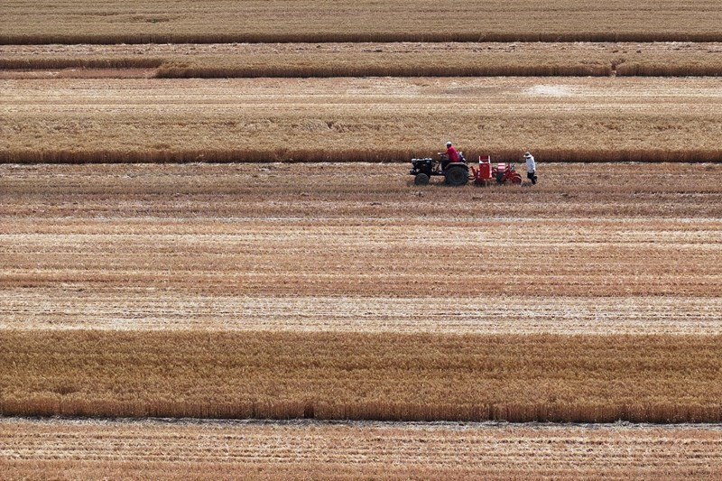 6月10日,在山東省聊城市茌平區(qū)博平鎮(zhèn)任何村,農(nóng)民駕駛農(nóng)機播種玉米(無人機照片)。