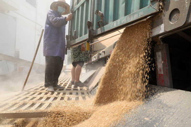 6月13日,河南省焦作市溫縣一家糧庫職工往倉庫儲運(yùn)夏糧。