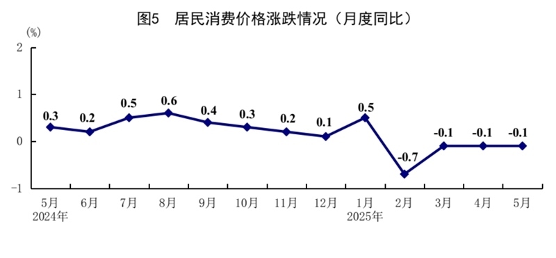 5月份,全國居民消費(fèi)價(jià)格(CPI)同比下降0.1%,環(huán)比下降0.2%。分類別看,食品煙酒價(jià)格同比上漲0.1%,衣著價(jià)格上漲1.5%,居住價(jià)格上漲0.1%,生活用品及服務(wù)價(jià)格上漲0.1%,交通通信價(jià)格下降4.3%,教育文化娛樂價(jià)格上漲0.9%,醫(yī)療保健價(jià)格上漲0.3%,其他用品及服務(wù)價(jià)格上漲7.3%。在食品煙酒價(jià)格中,鮮菜價(jià)格下降8.3%,糧食價(jià)格下降1.4%,豬肉價(jià)格上漲3.1%,鮮果價(jià)格上漲5.5%??鄢称泛湍茉磧r(jià)格后的核心CPI同比上漲0.6%,漲幅比上月擴(kuò)大0.1個(gè)百分點(diǎn)。1—5月份,全國居民消費(fèi)價(jià)格同比下降0.1%。