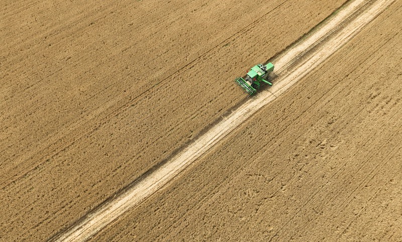 6月18日,河北石家莊晉州市周家莊鄉(xiāng)北捏盤(pán)村農(nóng)戶駕駛聯(lián)合收割機(jī)收割小麥(無(wú)人機(jī)照片)。