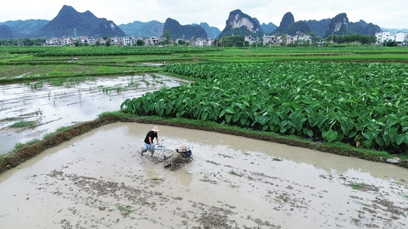 6月19日,廣西賀州市平桂區(qū)鵝塘鎮(zhèn)鵝塘村農(nóng)民操作農(nóng)機(jī)耕田(無人機(jī)照片)。