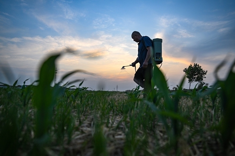 6月17日,河南省商丘市夏邑縣會(huì)亭鎮(zhèn)南街村村民在玉米田噴施除草劑。