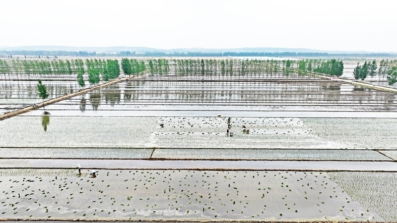 6月19日,山東省臨沂市郯城縣郯城街道農(nóng)民進(jìn)行水稻插秧(無人機(jī)照片)。