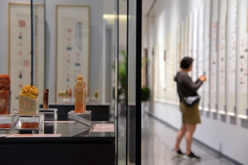 6月21日,觀眾在北京市海淀區(qū)三山五園文化藝術(shù)中心參觀薪傳國粹——“萬印樓”新藏當(dāng)代國際篆刻精品展。