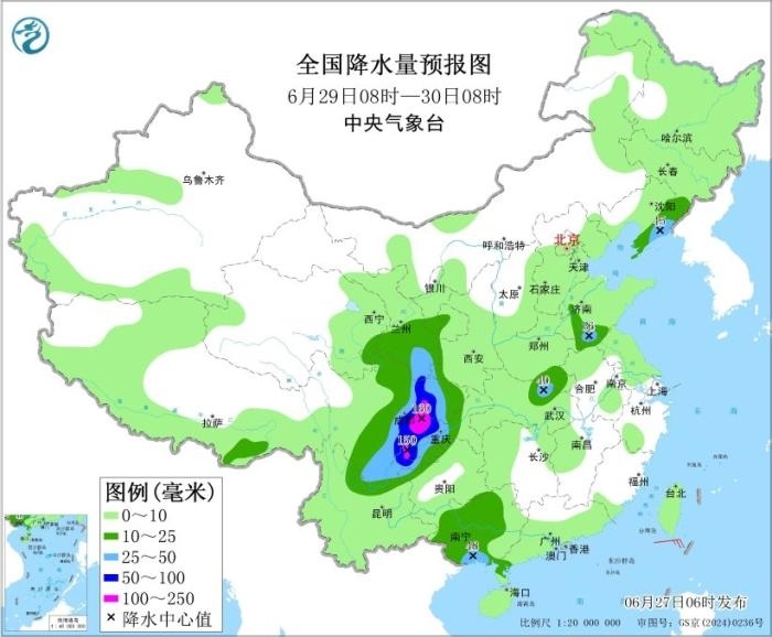 6月29日08時至30日08時,四川中東部、重慶西南部、甘肅東南部、云南東北部等地的部分地區(qū)有大到暴雨,局地大暴雨(100~160毫米)。