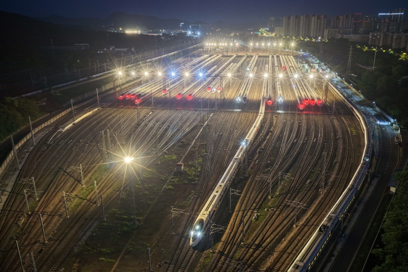 6月30日,動車組列車駛出南京動車段南京南動車運用所(無人機(jī)照片)。
