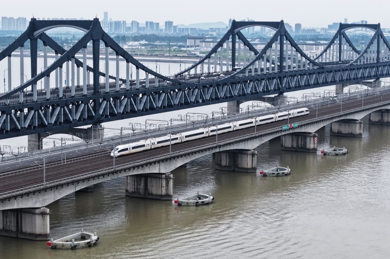 6月30日,一列動車組列車經(jīng)過武漢天興洲大橋延長線(無人機(jī)照片)。