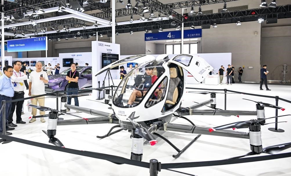 2025年9月5日,在重慶舉行的2025世界智能產(chǎn)業(yè)博覽會上,觀眾在長安汽車展區(qū)參觀、體驗(yàn)“飛行汽車”。新華社記者王全超攝