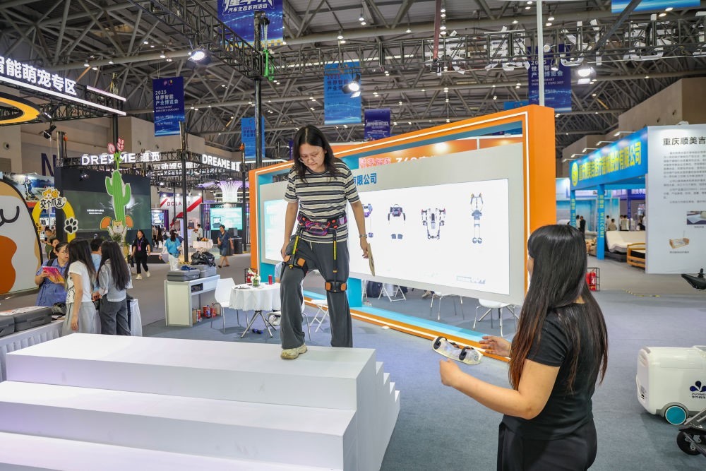 2025年9月5日,在重慶舉行的2025世界智能產(chǎn)業(yè)博覽會上,觀眾體驗(yàn)外骨骼機(jī)器人。新華社記者黃偉攝