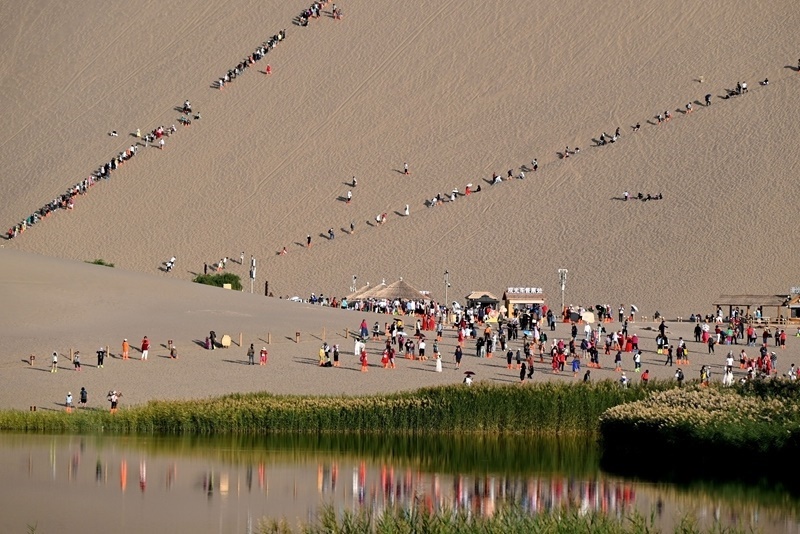 9月13日,游客在甘肅省敦煌市鳴沙山月牙泉景區(qū)游覽。