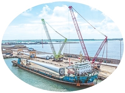 在山東省榮成市石島管理區(qū)的海上風(fēng)電產(chǎn)業(yè)基地,超大型風(fēng)電葉片正在吊裝和運(yùn)輸,準(zhǔn)備運(yùn)往海上作業(yè)區(qū)進(jìn)行安裝。李信君攝(人民視覺)