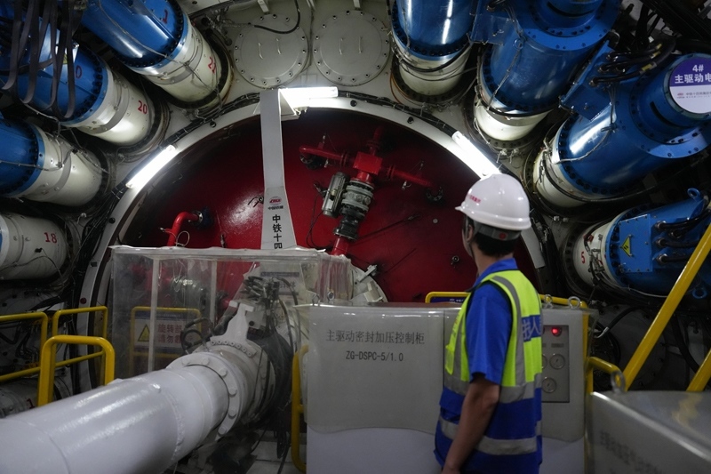 9月22日,中鐵十四局技術(shù)人員在甬舟鐵路金塘海底隧道“甬舟號(hào)”盾構(gòu)機(jī)內(nèi)關(guān)注設(shè)備運(yùn)行情況。