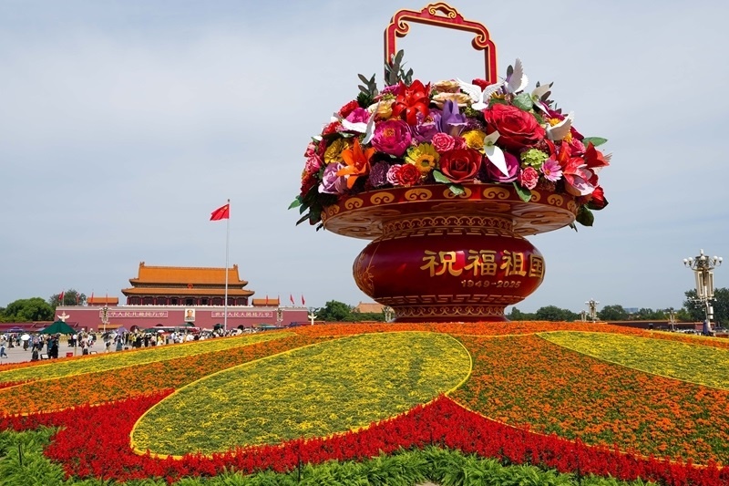 9月25日,2025年“祝福祖國”巨型花籃正式完工,亮相天安門廣場與市民共度佳節(jié)。今年“祝福祖國”花壇以喜慶的花籃為主景,花壇頂高18米,籃體高16米,籃盤直徑12米。籃體南側(cè)書寫“祝福祖國”“1949-2025”字樣,籃體北側(cè)書寫“歡度國慶”“1949-2025”字樣。籃內(nèi)選取了美好寓意的花卉,其中荷花寓意“和和美美”、橄欖枝寓意“榮耀和平”等,還結(jié)合和平鴿元素,體現(xiàn)“和平發(fā)展、欣欣向榮”。