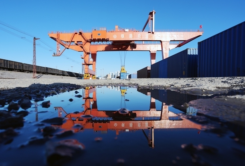 9月27日,在綏芬河站集裝箱換裝場,龍門吊在對回程中歐班列進(jìn)行換裝作業(yè)。