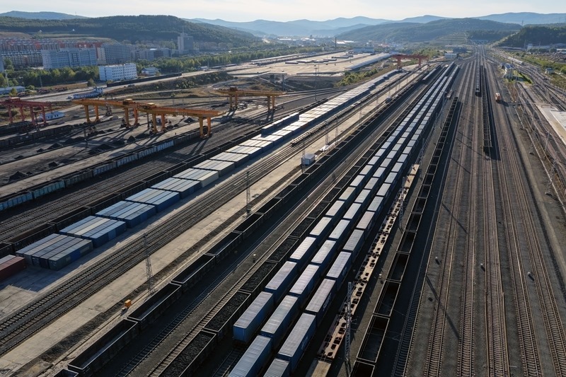9月27日,滿載貨物的列車在綏芬河站北場進(jìn)行換裝作業(yè)(無人機照片)。