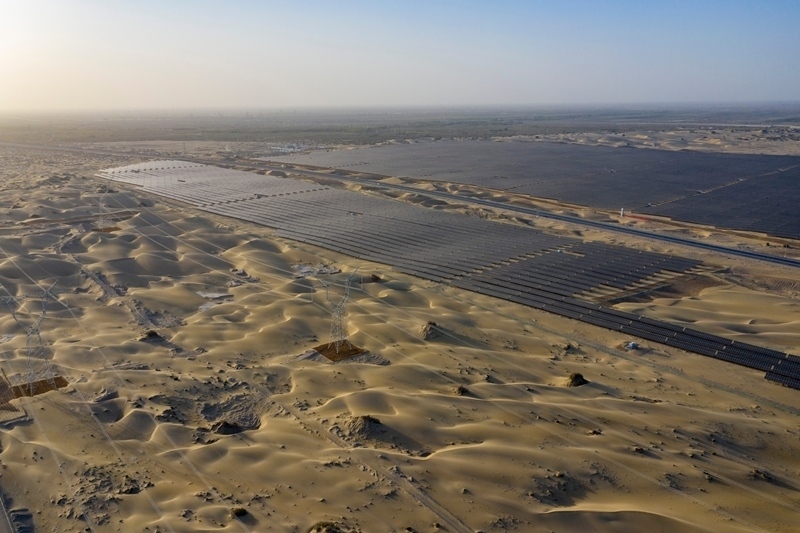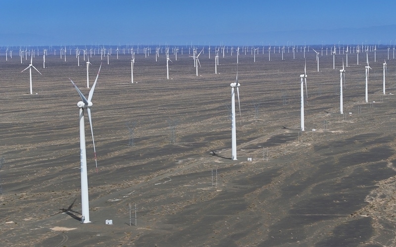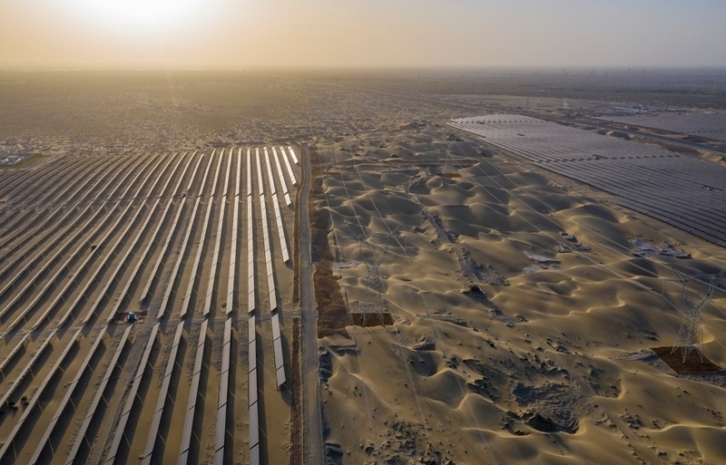昔日的戈壁荒漠,如今由太陽能光伏板匯聚成“藍色海洋”,由風力發(fā)電機組成“白色森林”,正孕育著無限“風光”。