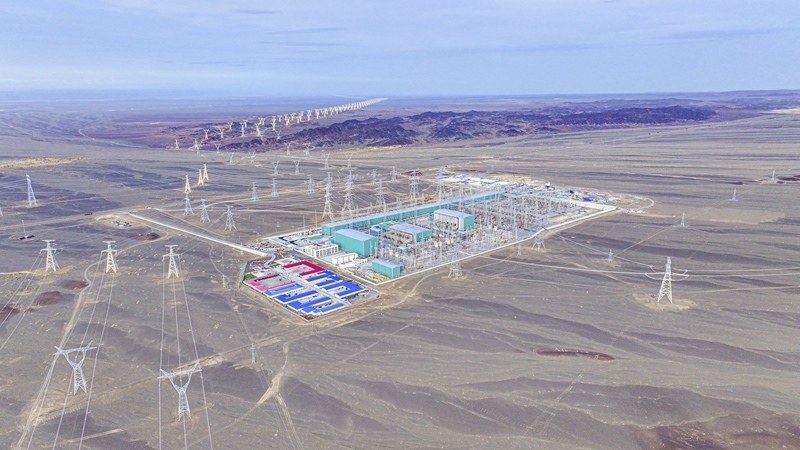 9月22日在新疆巴音郭楞蒙古自治州若羌縣拍攝的三峽集團“疆電外送”第四通道電源項目施工現(xiàn)場(無人機照片)。