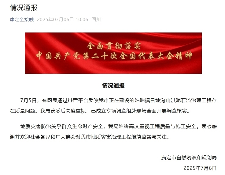 中新網(wǎng)7月6日電 據(jù)“康定全接觸”微信公眾號消息,7月5日,有網(wǎng)民通過抖音平臺反映四川省康定市正在建設(shè)的姑咱鎮(zhèn)日地溝山洪泥石流治理工程存在質(zhì)量問題??刀ㄊ凶匀毁Y源和規(guī)劃局獲悉后高度重視,已成立專項(xiàng)調(diào)查組赴現(xiàn)場全面開展調(diào)查核實(shí)。