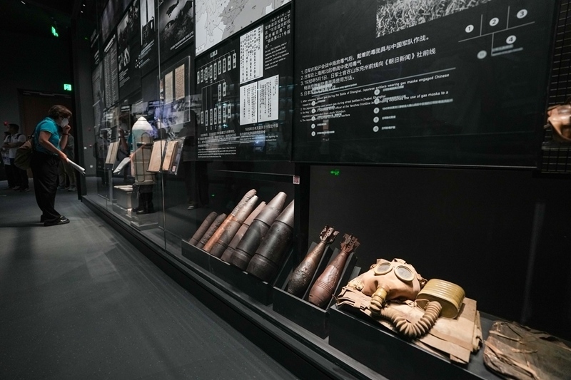 7月8日,在中國(guó)人民抗日戰(zhàn)爭(zhēng)紀(jì)念館《為了民族解放與世界和平》主題展覽上,參觀者在展示日本侵略者實(shí)施細(xì)菌戰(zhàn)和化學(xué)戰(zhàn)暴行的區(qū)域參觀。