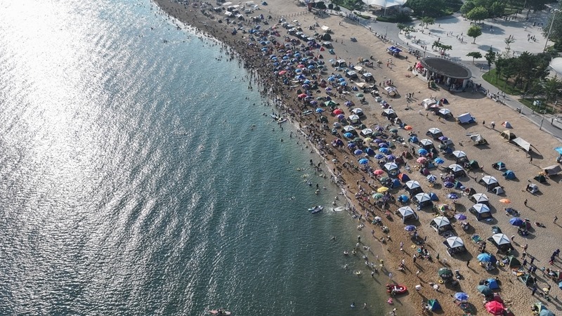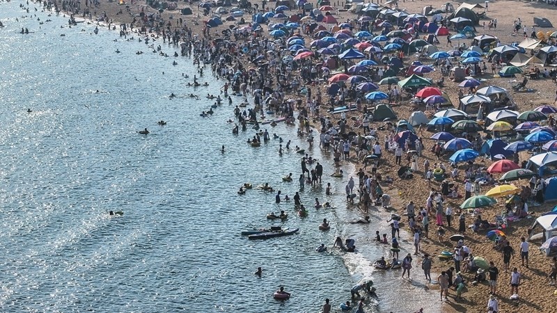 近日,遼寧省大連市持續(xù)高溫天氣,大連傅家莊公園海濱沙灘迎來大量游客,人們?cè)诤I沙灘戲水消暑。