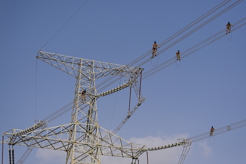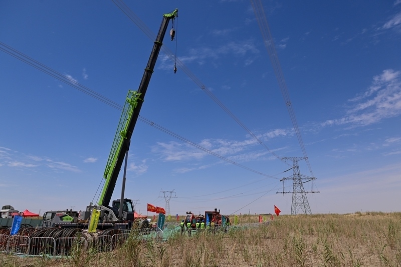 在民豐-且末750千伏線(xiàn)路,作業(yè)人員開(kāi)展緊線(xiàn)作業(yè)(7月12日攝)。