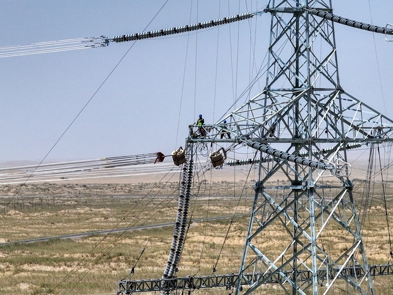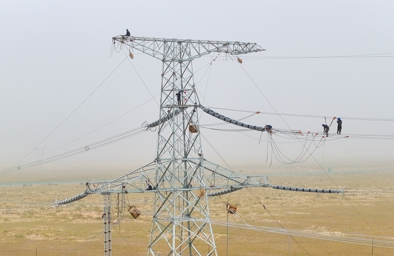 施工人員在且末-若羌750千伏線(xiàn)路開(kāi)展走線(xiàn)消缺工作(6月24日攝)。
