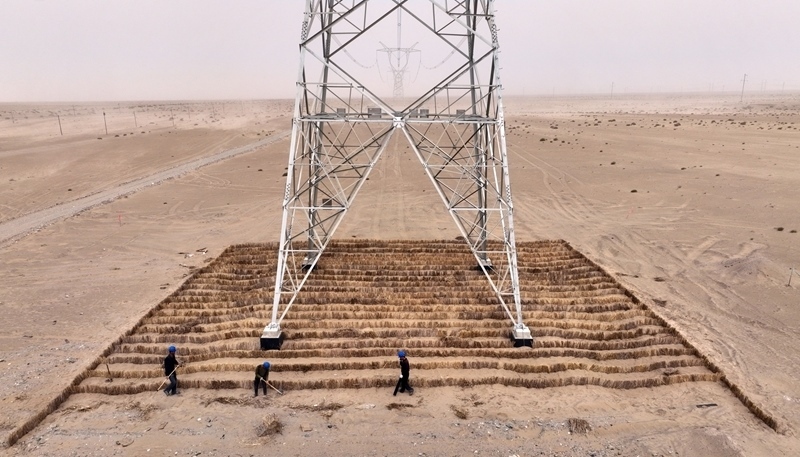 新疆和田地區(qū)于田縣,施工人員在線(xiàn)路塔基下鋪設(shè)草方格(4月24日攝)。