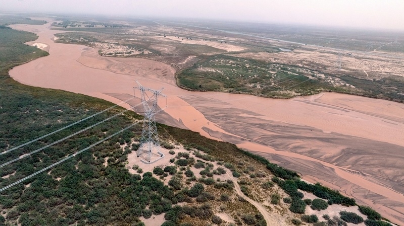 新疆環(huán)塔里木盆地750千伏輸電線(xiàn)路跨越車(chē)爾臣河(6月14日攝)。