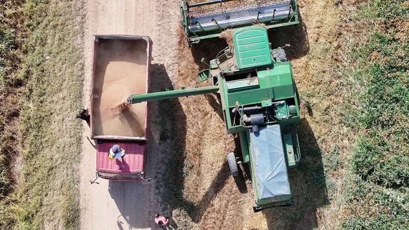 7月15日,收割機(jī)在銀川市賀蘭縣立崗鎮(zhèn)蘭星村收獲小麥(無人機(jī)照片)。