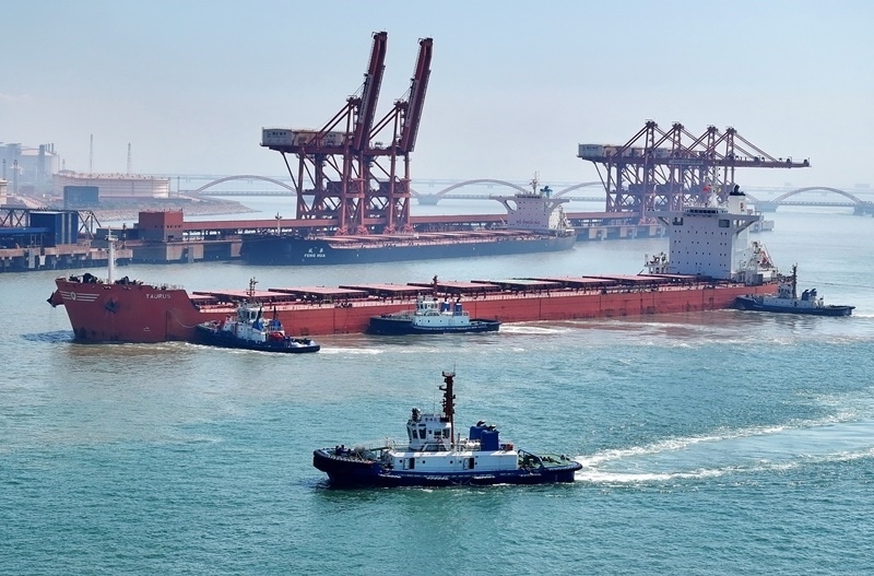 7月18日,輪船在拖輪的協(xié)助下向唐山港曹妃甸港區(qū)礦石碼頭靠泊(無人機照片)。