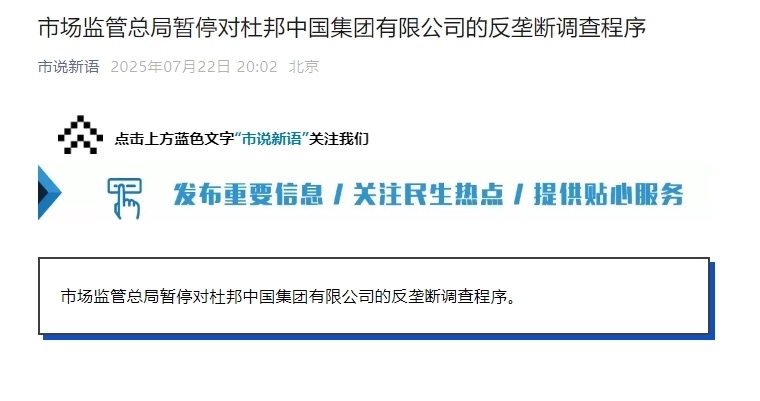 “市說新語”微信公眾號(hào)消息,市場監(jiān)管總局暫停對杜邦中國集團(tuán)有限公司的反壟斷調(diào)查程序。