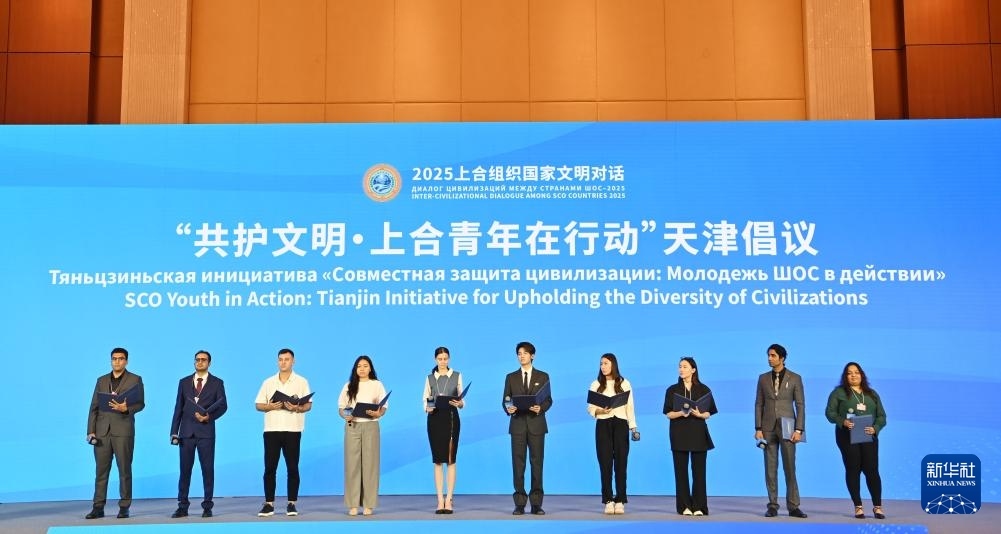 7月23日在2025上合組織國家文明對話現(xiàn)場拍攝的“共護(hù)文明·上合青年在行動(dòng)”天津倡議發(fā)布環(huán)節(jié)。新華社記者 李然 攝