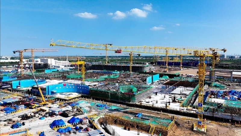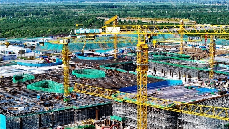 7月25日,在津濰高鐵山東東營高鐵站現(xiàn)代綜合客運樞紐及配套工程建設現(xiàn)場,中鐵二十局工作人員在施工(無人機照片)。