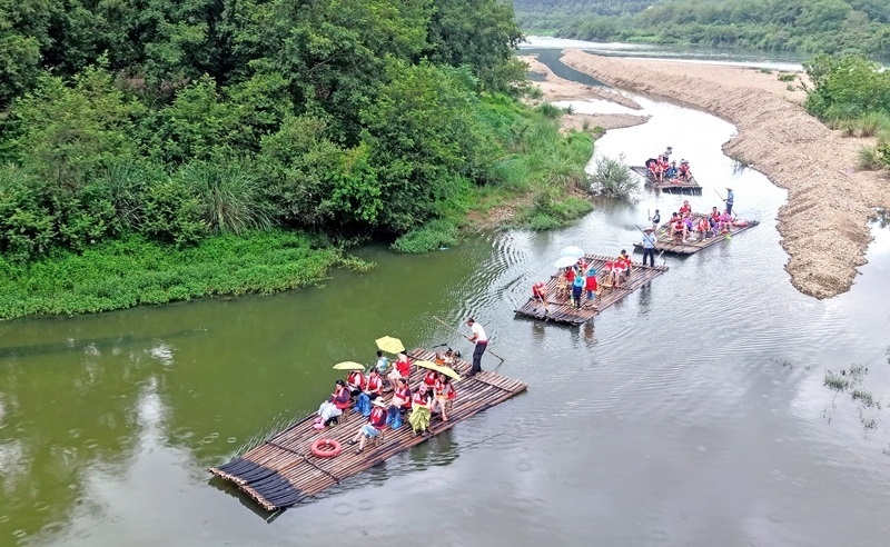 7月25日,游客在浙江省臺(tái)州市仙居縣永安溪乘坐竹筏漂流(無人機(jī)照片)。