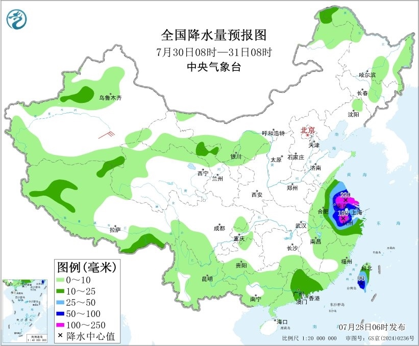 7月29日08時至30日08時,內蒙古東北部、黑龍江北部、吉林中部、遼寧北部、江蘇南部、上海、浙江中東部、臺灣島中南部、廣東南部等地的部分地區(qū)有大到暴雨,其中,浙江中東部等地的部分地區(qū)有大暴雨(100~200毫米)。內蒙古東部有4~5級風。東海大部海域、臺灣以東洋面偏南海域、巴士海峽將有7~8級、陣風9級的西南風,臺風中心經(jīng)過的附近海域風力可達9~10級、陣風11~12級。