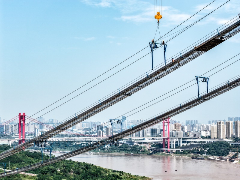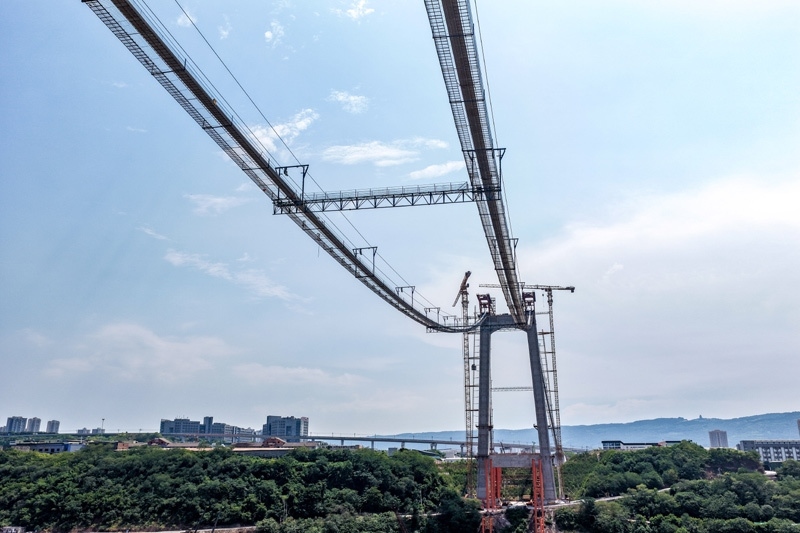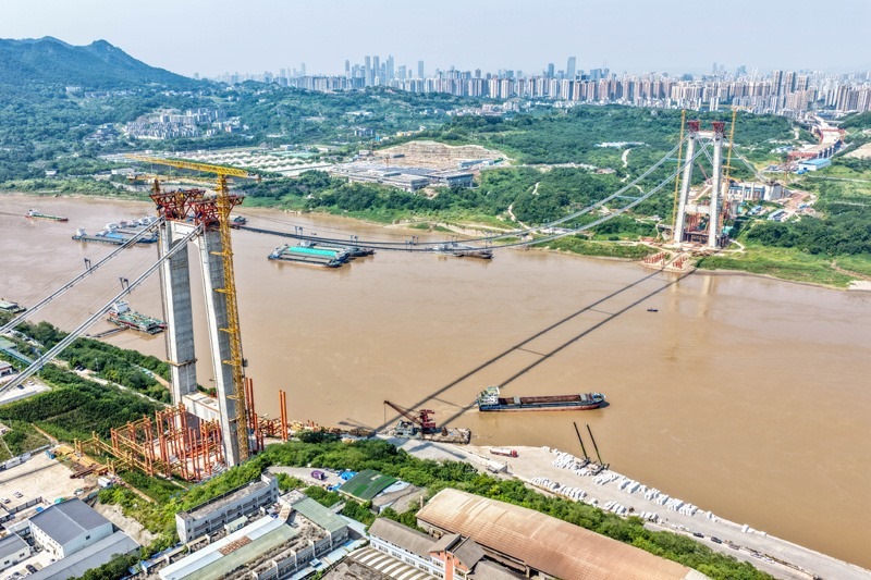 當日,由重慶城投集團投資、城投建設(shè)公司組織建設(shè)、中國鐵建大橋局承建的黃桷沱長江大橋順利完成主纜架設(shè)工作,標志著大橋建設(shè)即將進入鋼桁梁吊裝工序。黃桷沱長江大橋全長1260米,主跨765米,為單跨懸吊雙塔三跨連續(xù)鋼桁梁懸索橋,是國內(nèi)最大跨徑公軌兩用懸索橋。黃桷沱長江大橋是渝長高速復線連接道工程的控制性節(jié)點工程,建成后將成為聯(lián)系重慶主城區(qū)長江南北兩岸的重要交通干道。