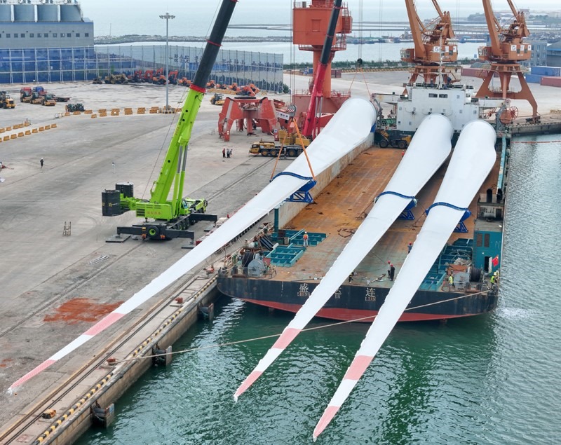 7月31日,在山東港口煙臺港蓬萊港區(qū),超大尺寸海上風(fēng)電葉片被吊裝上船(無人機(jī)照片)。
