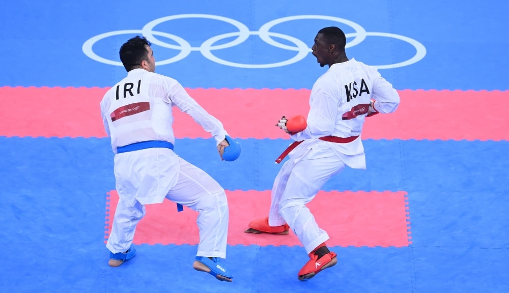 空手道作為“新增項(xiàng)目”之一進(jìn)入了東京奧運(yùn)會,但未能在巴黎奧運(yùn)會上繼續(xù)入圍。圖為東京奧運(yùn)會,伊朗選手薩賈德(左)與沙特選手哈米迪在空手道比賽中。黃宗治 攝