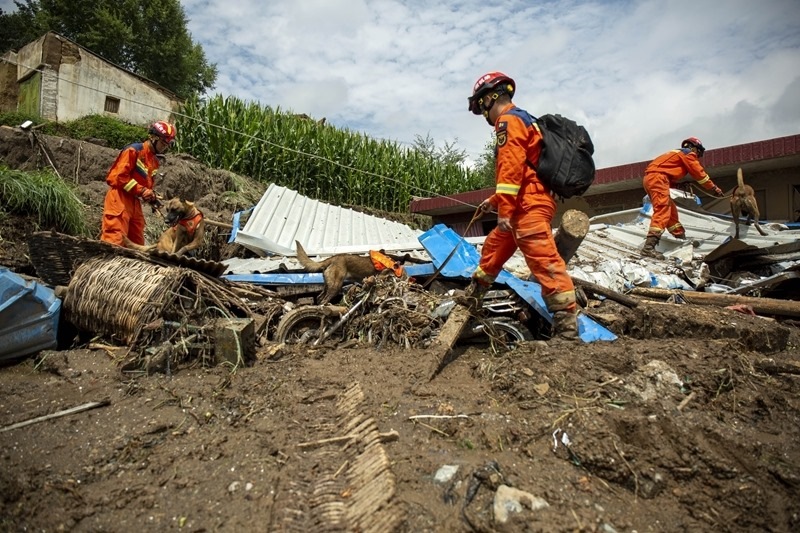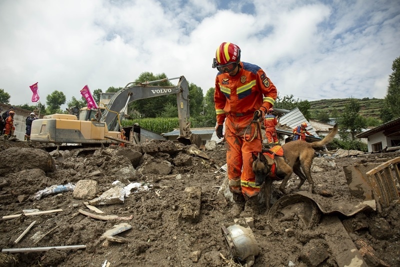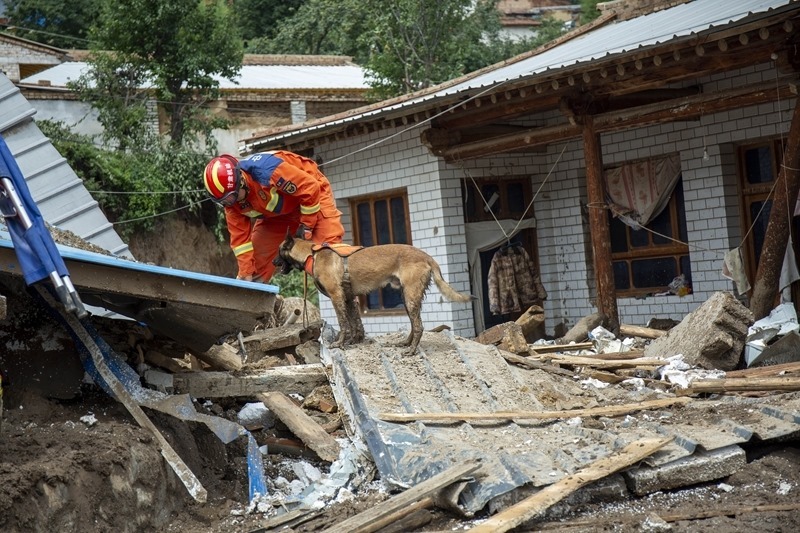 8月9日,國(guó)家西北區(qū)域應(yīng)急救援中心指戰(zhàn)員在馬坡鄉(xiāng)舊莊溝村攜帶搜救犬配合大型機(jī)械搜救失聯(lián)人員。