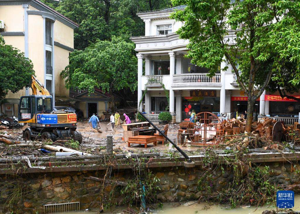 8月6日,工作人員在廣東肇慶鼎湖區(qū)鼎湖山風(fēng)景區(qū)門口清淤。