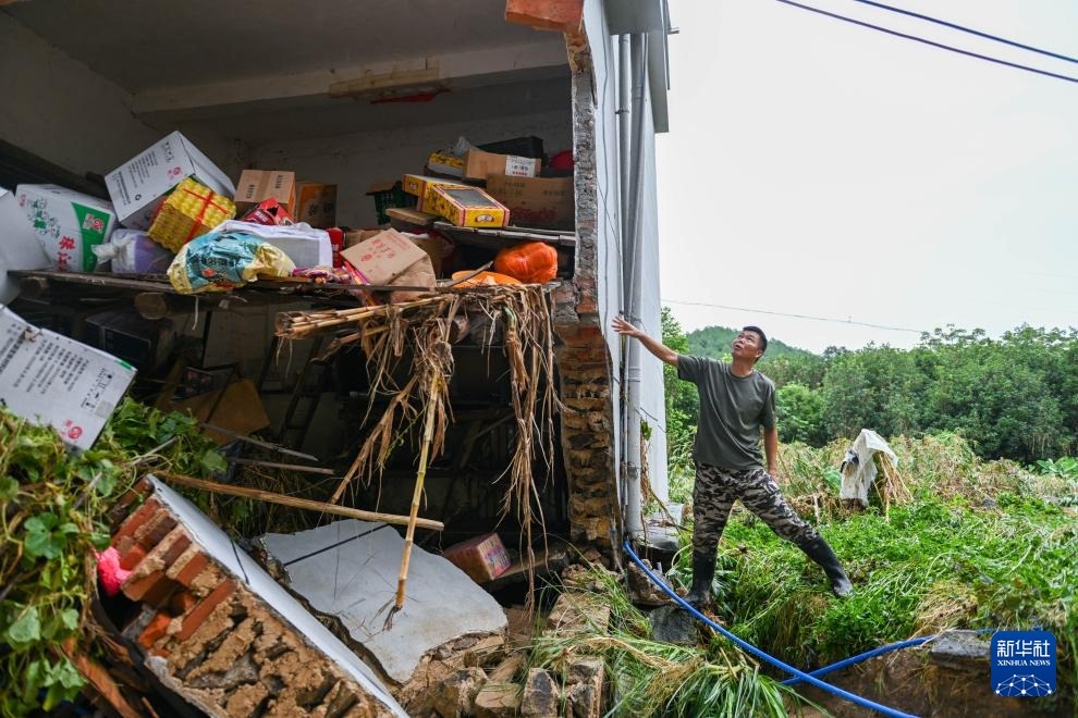8月6日,廣東清遠(yuǎn)佛岡縣石角鎮(zhèn)黃花村黨委書記李庚原在一棟被沖毀的房屋旁了解房屋受損情況。