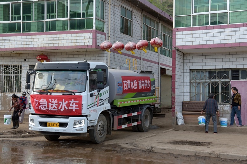 8月11日,在榆中縣城關(guān)鎮(zhèn)興隆山村,當?shù)厮畡?wù)部門為村民送去飲用水。