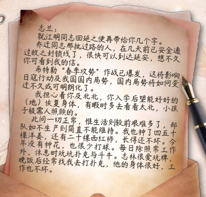 這封家書(shū)是1942年5月22日晚,即左權(quán)將軍壯烈殉國(guó)前三天寫(xiě)給愛(ài)妻劉志蘭的最后一封信,也是一封充滿(mǎn)著愛(ài)情與親情的遺書(shū)。