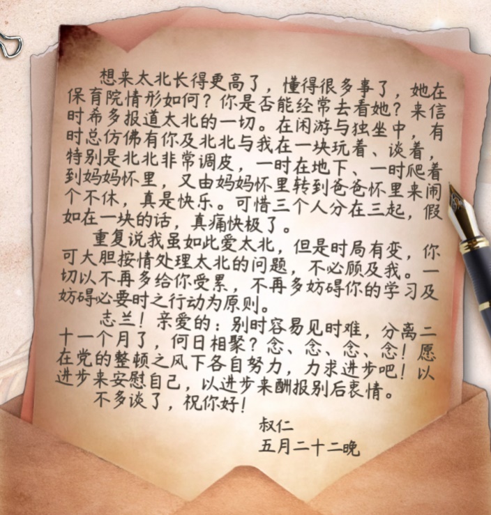 在信的最后,左權(quán)不得不忍痛交代妻子:“我雖如此愛(ài)太北,但是時(shí)局有變,你可大膽按情處理太北的問(wèn)題,不必顧及我?!辈⒚銊?lì)妻子以進(jìn)步來(lái)安慰自己,以進(jìn)步來(lái)酬報(bào)別后衷情。