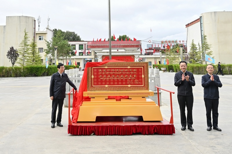8月23日上午,受習(xí)近平總書記囑托,帶著黨中央的親切關(guān)懷和全國人民的深情祝福,中央代表團(tuán)部分成員在日喀則看望慰問各族干部群眾。這是王滬寧和中央代表團(tuán)部分成員向日喀則市贈送賀匾。新華社記者 殷博古 攝