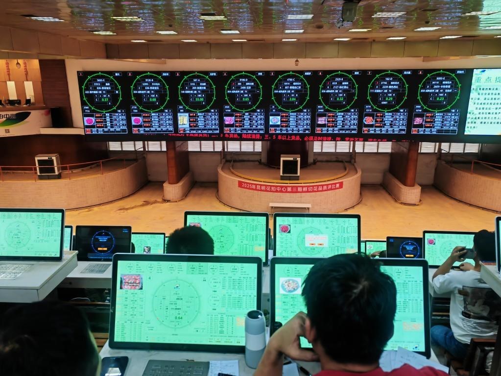 記者在昆明國際花卉拍賣交易中心看到,拍賣大鐘界面顯示著各種花卉的信息,數(shù)百名購買商操作著競價(jià)器選購鮮花。昆明國際花卉拍賣交易中心副總經(jīng)理汪洋介紹,這里每天的鮮花交易量都超700萬枝,單日最高交易量超1100萬枝,30%以上的鮮花被各大電商和直播團(tuán)隊(duì)拍下,他們再拿到電商平臺或直播間銷售。
