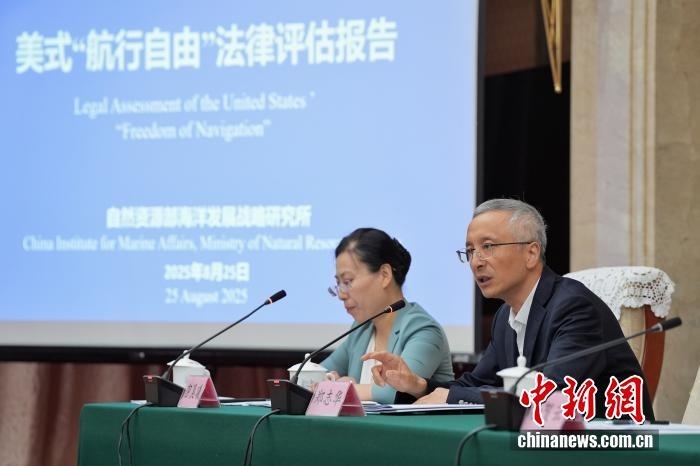 8月25日,中國自然資源部海洋發(fā)展戰(zhàn)略研究所在北京發(fā)布《美式“航行自由”法律評估報告》中英文版。該《報告》旨在對美國“航行自由”相關(guān)主張和實踐是否符合國際條約和一般國際法、是否具備法律基礎(chǔ)進(jìn)行評估。圖為自然資源部海洋發(fā)展戰(zhàn)略研究所前所長張海文(右二)答記者問。中新社記者 張祥毅 攝