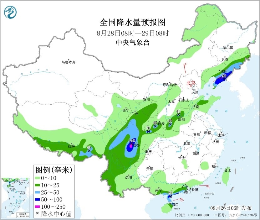 8月27日08時至28日08時,內(nèi)蒙古中東部、遼寧中南部、青海東部和南部、甘肅南部、寧夏、陜西北部、山西中北部、京津冀、四川盆地西部、川西高原北部、云南南部、廣西西南部、海南島等地有中到大雨,其中,遼寧西南部、河北中北部、北京、天津、四川盆地西部、甘肅西南部等地的部分地區(qū)有暴雨或大暴雨(100~200毫米)。內(nèi)蒙古中部、遼東半島、山東半島等地的部分地區(qū)有4~5級風。渤海有5~7級、陣風8級的偏東風,南海東北部海域有6~7級、陣風8級的偏東風,南海東南部海域有5~7級、陣風8級的偏西風。