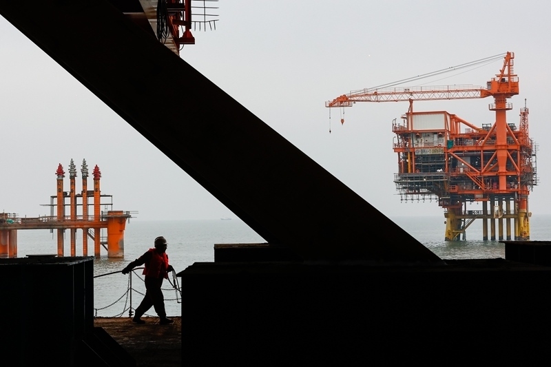 9月8日,工人穿梭在墾利6-1油田10-1北區(qū)塊Ⅱ期開發(fā)項目油氣平臺安裝作業(yè)現(xiàn)場。